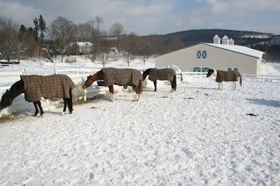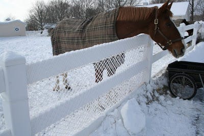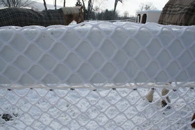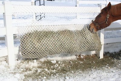 Since this system has worked so well in our stalls, first with Freedom Feeders, and now with the "hockey hay nets," I decided to try an experiment for making outside hay feeding easier using these sturdy hockey nets.