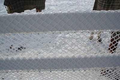 This worked great for months, and the Freedom Feeders held up pretty well, but our biggest, hungriest hippos eventually ate through the nets. While researching new materials, I came across these hockey nets which are sold in bulk and cut to the desired length at Arizona Sports Equipment. They are super-sturdy nets available in a variety of sizes and lengths, they are fairly chew and paw-proof, and the cording is wide enough that it's unlikely a shoe will get caught in it, so they can be hung low to the ground. Another nice bonus is that they are woven rather than knotted, so I think the smoother texture must be easier on the horses.