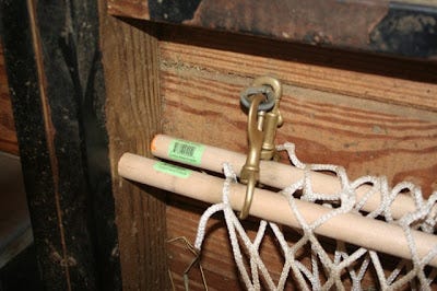 Someone had woven two poles through either side of the top of the net so it could be opened and closed like a sandwich bag. I bought a few Freedom Feeder nets because of their size and square shape, got some dowels from the hardware store and made some up. I used the big sturdy snaps I normally hung my hay nets with, which have a 1" ring at one end, to slide over the ends of the dowels. They were secured to the wall with some screw eyes. Then all I had to do to fill a net was unsnap two snaps, drop in the hay, and snap them back up.