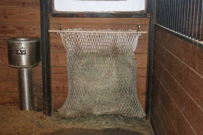 I'm a big fan of slow feed nets for my horses. Not only do they slow down my hungry hippos, keep them busy and their bellies full until morning, they also help reduce waste. I used to simply hang a net or two in each stall, but filling them got to be a chore, so I fixed half the net to the bars to make them easier to fill and then tied the pull-rope off to close them. That worked well for a while until I saw a neat idea on another site and decided to give it a try.